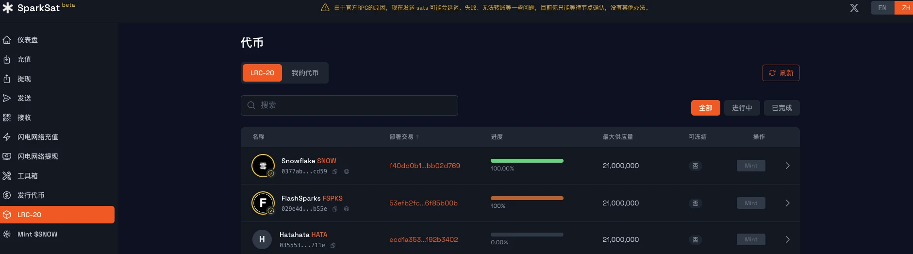 SparkSat 是 Spark 协议上第一个功能齐全的网页钱包工具,其也是 LRC 20 代币 SNOW 的项目方,并非由 Spark 官方运营。通过将助记词导入 SparkSat,用户可清晰查看自己的资产情况,也可直接通过 SparkSat 的前端进行比特币主网的存提款和 Spark 网络及闪电网络的交易。也可以直接使用该工具发行 LRC 20 代币及一站式查看所有 LRC 20 代币,堪称 Spark 协议的“Unisat”。