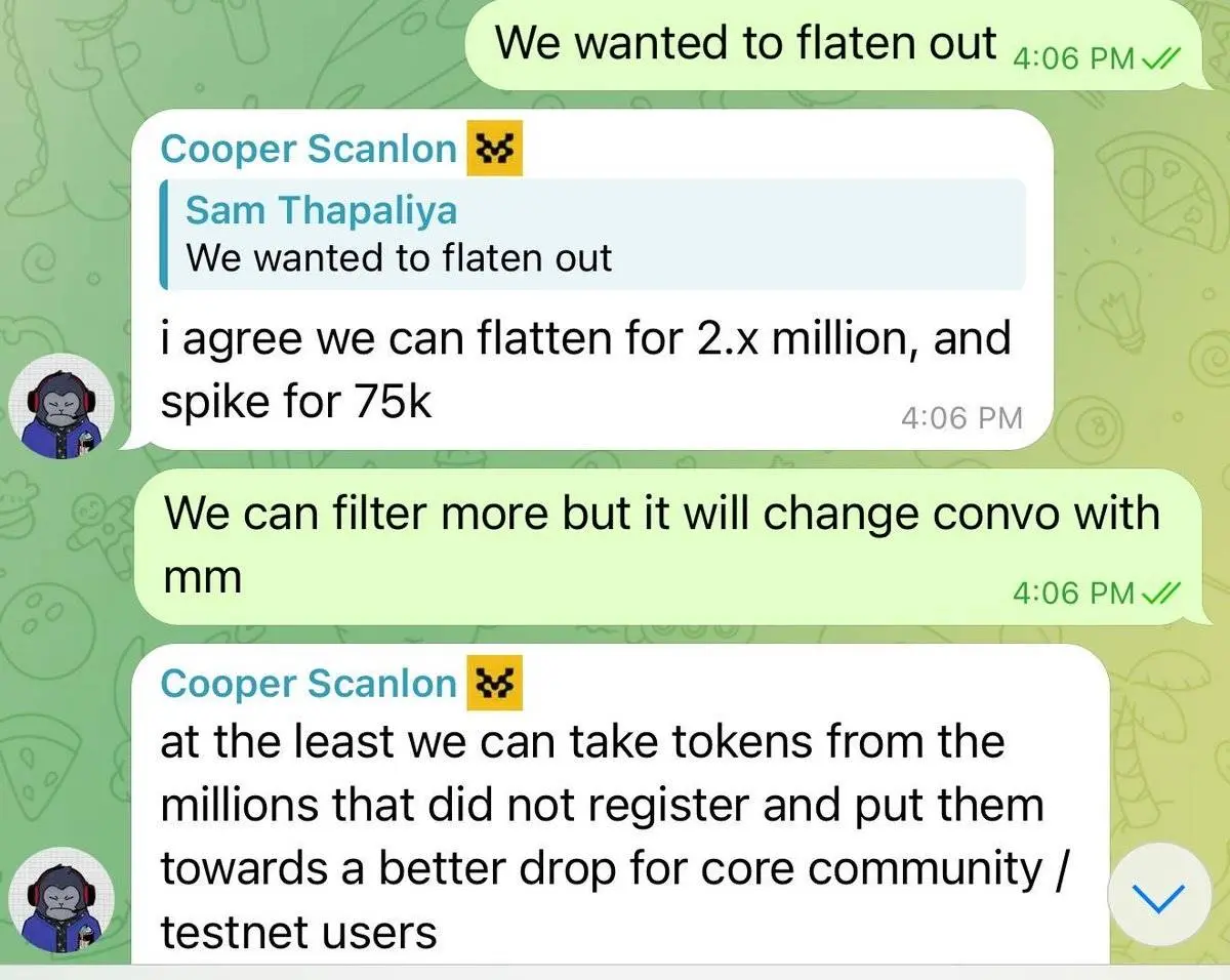 由于数据集存在诸多问题,我向 Cooper 建议将所有空投参与者的奖励平摊。然而,在此期间,Cooper 坚持要让一组特定的 75,000 个钱包获得每个钱包最高比例的代币分配。