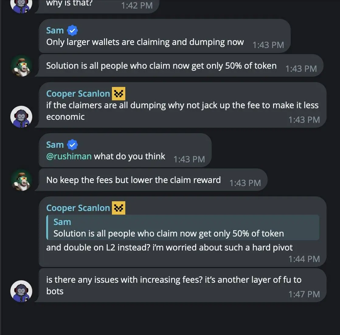 在领取过程中,当我们意识到这 75,000 个钱包的问题时,我再次建议平摊奖励以减少 Sybil 攻击(虚假账户)捆绑和抛售的影响。然而,Cooper 选择提高领取费用,这导致除了这 75,000 个钱包之外,几乎没有其他用户能够领取空投奖励。