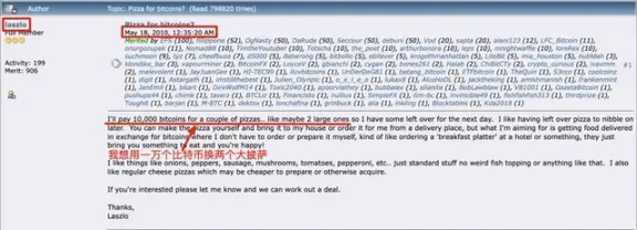 2010 年 5 月 18 日 12:35 分,一位 ID 为 Laszlo 的用户在比特币论坛发布一个悬赏贴,愿意用一万枚比特币换两个大号披萨,卖家可以自己制作,也可以给他点外卖,在帖子里他还详细说明了自己的口味喜好。此前 4 月 16 日,他加入了比特币创始人中本聪发起的论坛 Bitcoin Talk Forum。