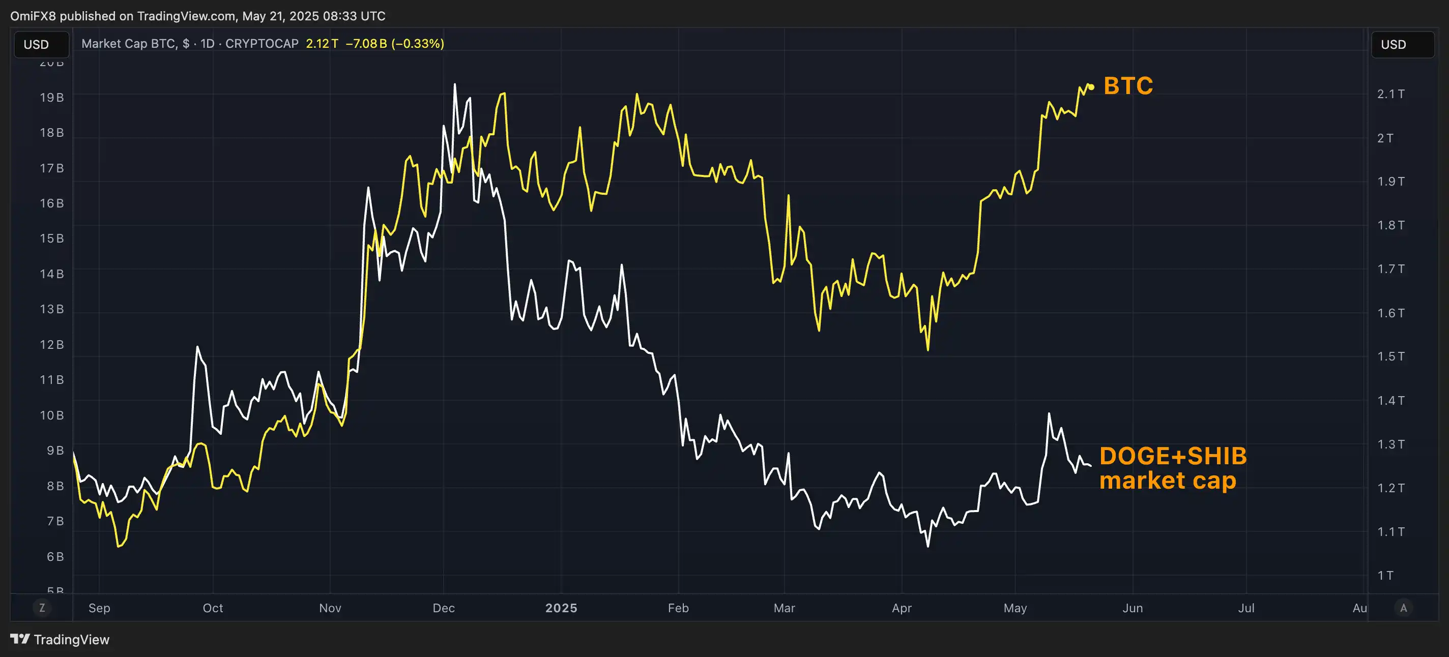 但目前并未出现类似迹象,DOGE 与 SHIB 的总市值仍远低于 1 月的高点。