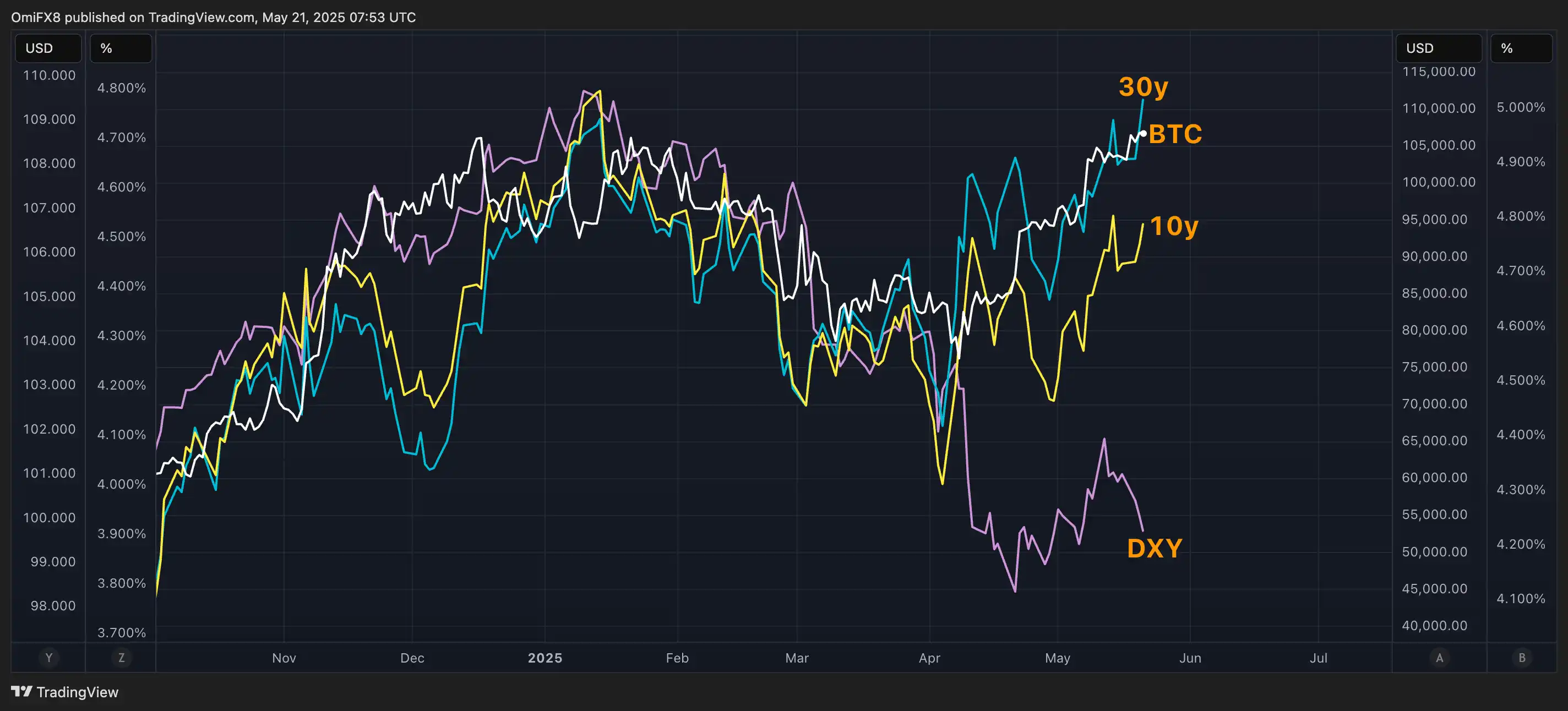虽然 30 年期美债收益率已升至 5% 以上,回到 1 月水平,但市场普遍认为这对比特币和黄金是利好因素。