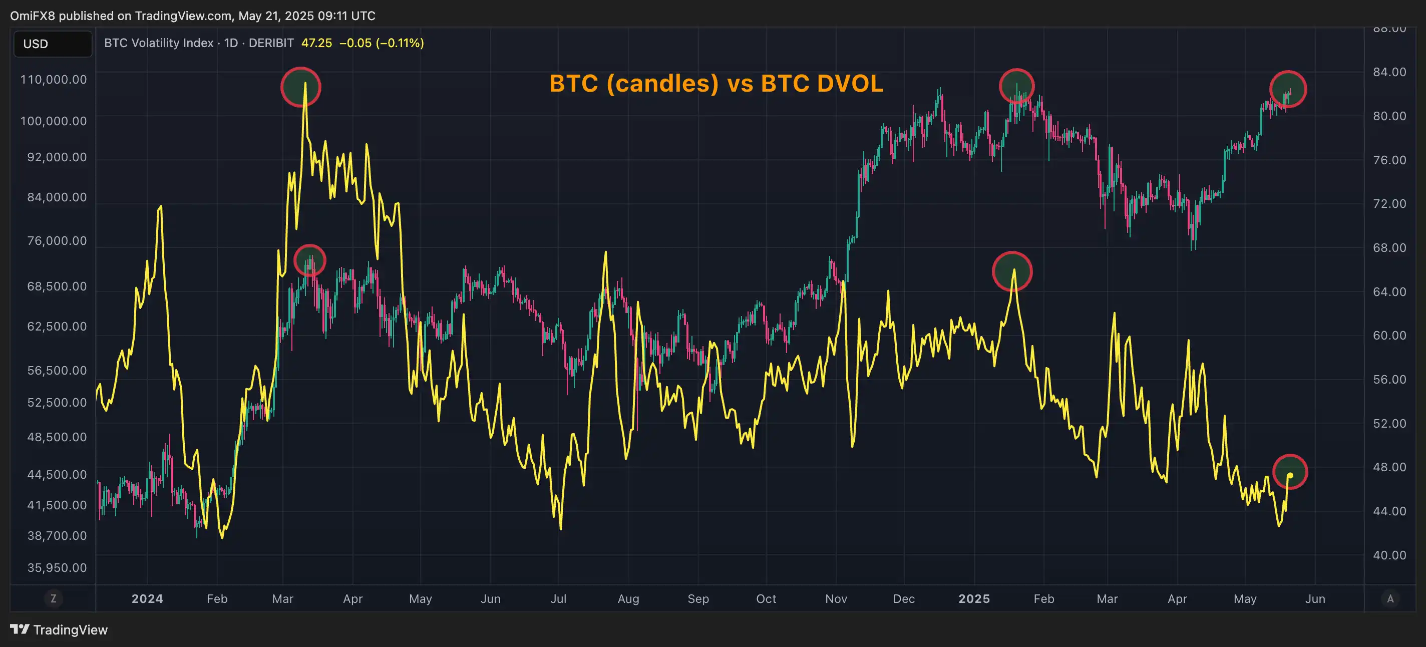 从隐含波动率来看,当前比特币市场显得更为平静。Deribit 的 DVOL 指数(反映未来 30 天的预期波动率)明显低于去年 12 月至今年 1 月,以及 2024 年 3 月出现价格高点时的水平。