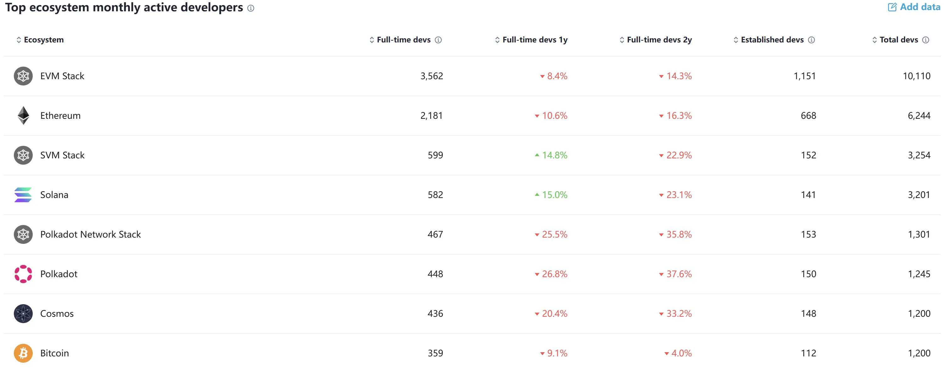 据DeveloperReport 数据,当前 BTC 生态的全职开发者仅为 359 人,其中具备一年经验的全职开发者数量下降了 9.1%,二年以上经验的开发者也减少了 4%。仅按主链开发者(不含 EVM、SVM 栈)计,比特币在所有链中排名第五,远低于排名第一的以太坊(2181 人),后者的开发者数量是比特币的 6 倍。