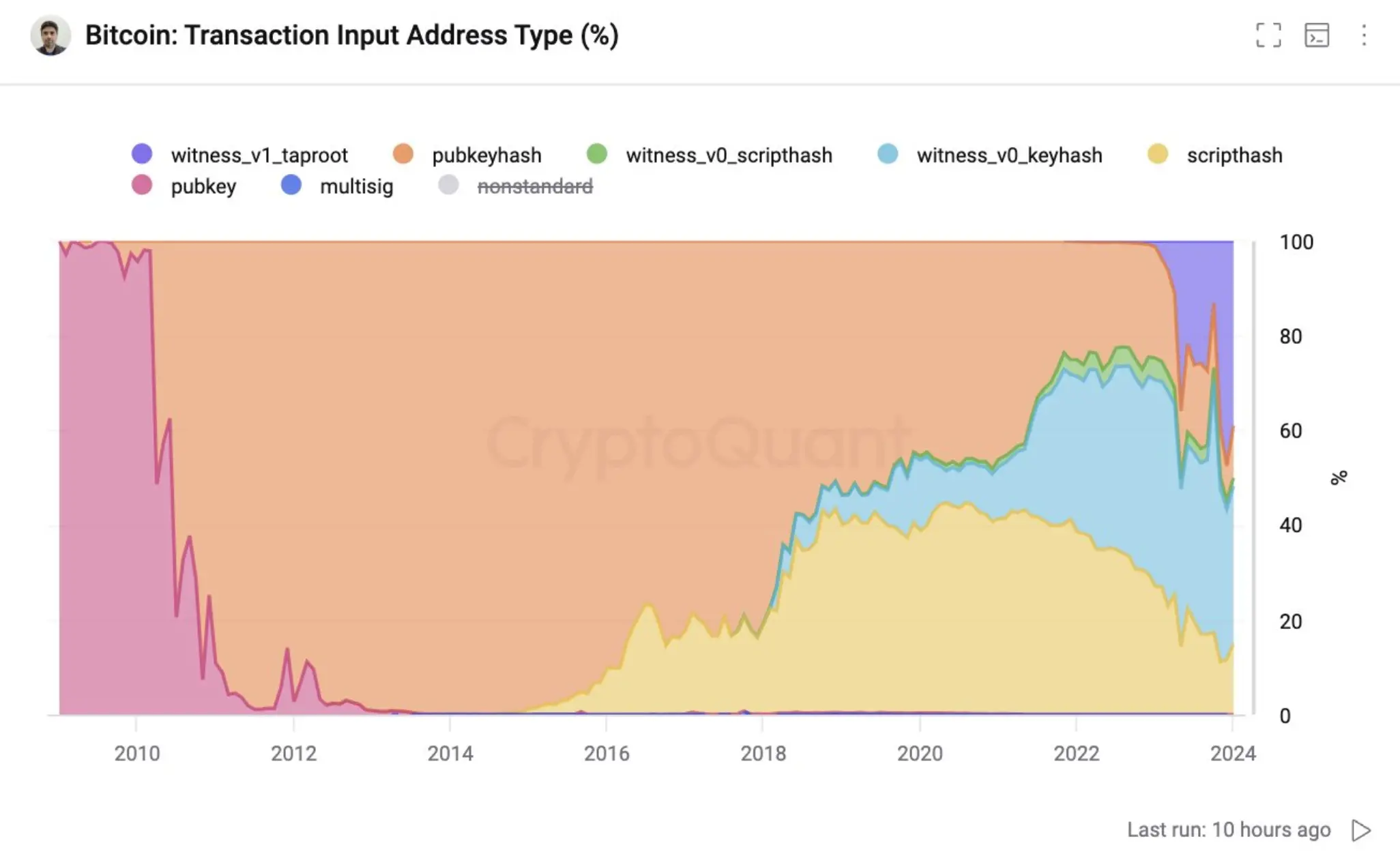 比特币网络的每一次重大升级几乎都经历了漫长的接受过程。SegWit 在启用两年后仅覆盖约 50% 的交易,四年后才接近 80%;2021 年 11 月激活的 Taproot 同样缓慢,2023 年初采用率不足 1%,至 2024 年初才达到 39%。开发者和社区对协议演进的极度谨慎。