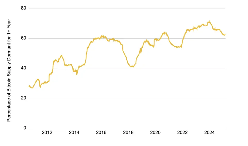 庞大的 BTC 存量并未转化为金融生产力,而是沉淀为链上的“休眠资本”。据 Binance Research 最新研究显示,目前仅有 0.79% 的 BTC 被实际用于 DeFi,而过去一年内未发生转账的比特币已占总供应量的 60% 以上,且这一比例仍在持续攀升。