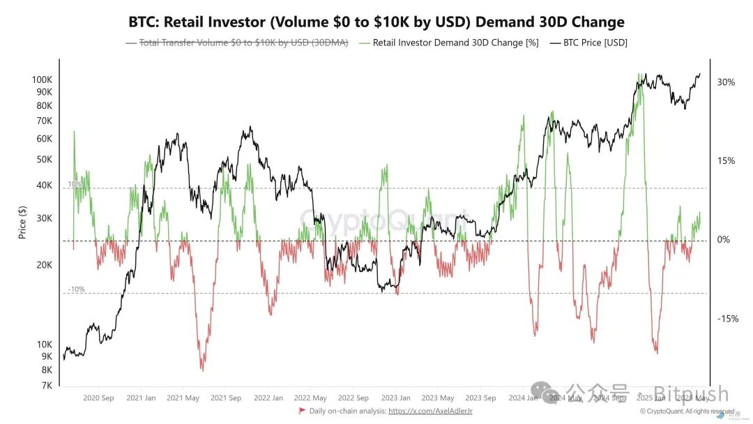 根据CryptoQuant的数据,在比特币接近历史高点时,散户投资者(定义为单笔交易0-1万美元的钱包)的交易量仅占总量的3.2%。这与2024年12月时的30%形成鲜明对比。这种差异可能意味着当前上涨主要由机构资金推动,而散户投资者要么持币观望,要么已经离场。