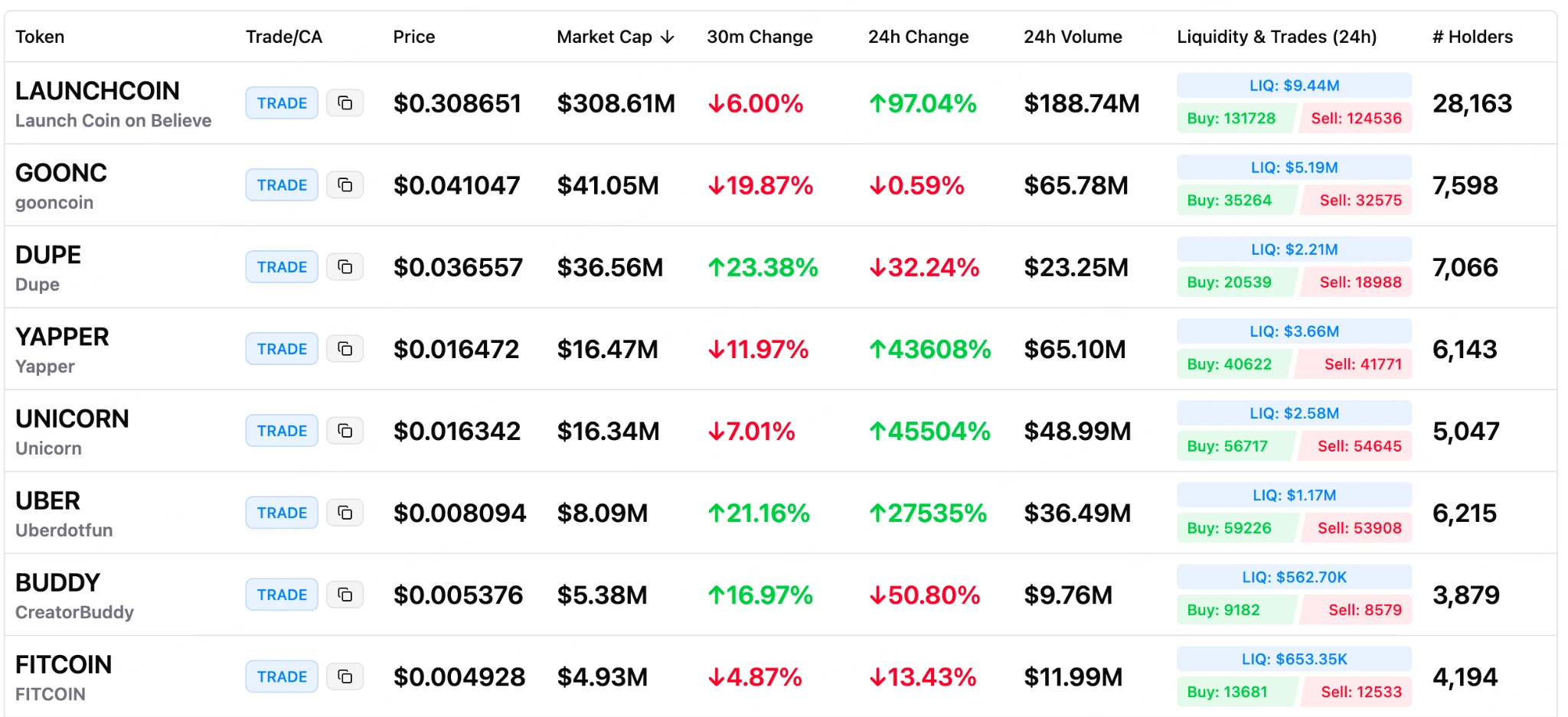 作为 Believe 生态的核心代币,LaunchCoin 由 Ben Pasternak 将其早期项目 PASTERNAK 代币升级而来,完整承载了从 Clout.me 到 Believe 平台的品牌进化路径。LaunchCoin 上线首日即创下 8000 万美元市值纪录,经历市场波动后自 5 月 11 日开启强势复苏,现以 3.3 亿美元市值实现较发行初期 40 倍增长,持币地址突破 2.7 万个。