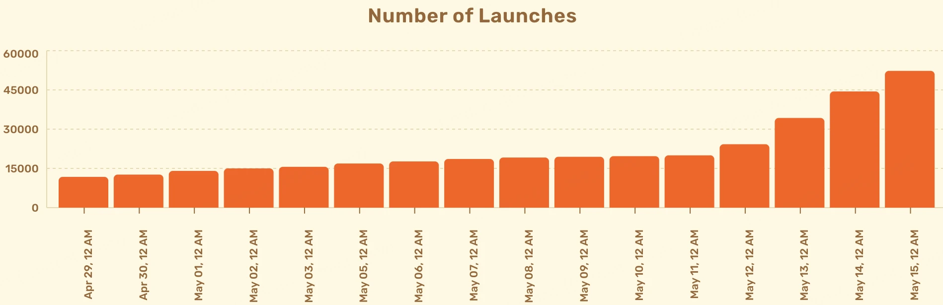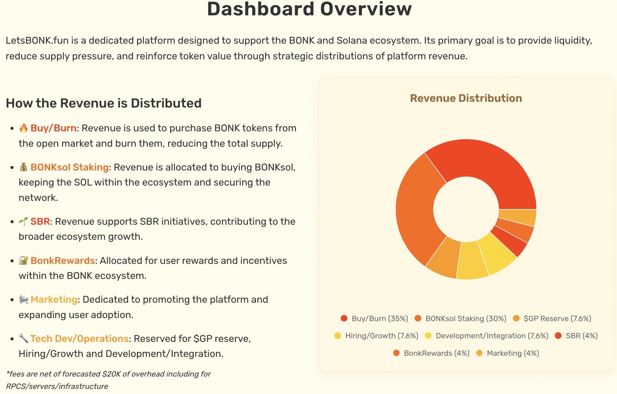 交易费用方面,平台上的每笔交易都会收取 1% 的手续费,用于开发资金池、BONKsol 验证者以及回购并销毁 BONK。LetsBonk.fun 35% 的营收回购并销毁 BONK 实现通缩模型, 30% 购买并质押 BONKsol 以维护网络安全与流动性;19.2% 拨入生态建设基金, 7.6% 用于战略储备,其余分配给技术开发与运营(招聘/增长与开发/集成各占 7.6% ), 12% 投入用户激励与推广,包括 4% BonkRewards、 4% 营销和 4% 支持社区治理(SBR)。从数据趋势看, 4 月 29 日至 5 月 15 日,平台日营收由约 2, 000 SOL 飙升至 24, 000 SOL,增长逾 12 倍,其中 5 月 15 日代币接近 50, 000 次(较平均水平提升 233% )。