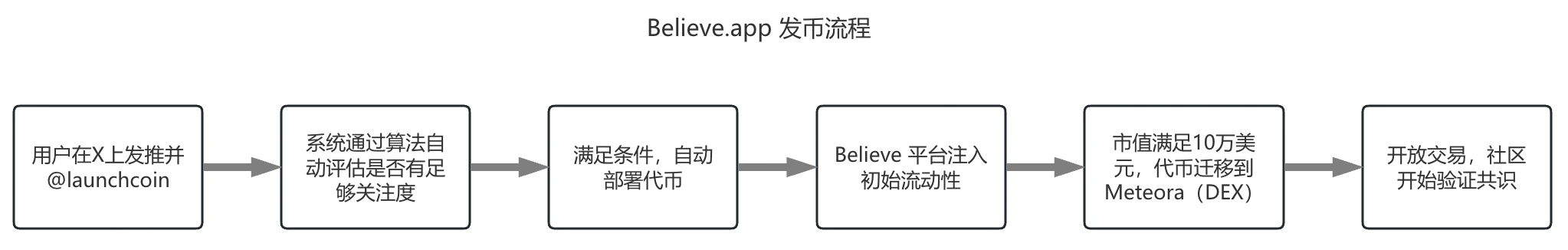 Believe 是由 Ben PasternakMEME 代币发行平台,前身为 Clout.me 主打“名人发币”模式,后续完成品牌升级后,该项目将核心定位聚焦于"社交资产化"领域。核心机制是用户只需在 X 发布带有$TICKER+NAME 格式并@launchcoin 的推文,系统即通过算法自动评估其社交影响力,触发智能合约部署代币的决策流程。通过审核的代币将首先进入联合曲线发行阶段,同时获得平台提供的 1 万美元种子基金支持创始团队。当项目市值突破 10 万美元门槛后,代币将进入流动性增强阶段,通过迁移至 Meteora 协议获得深度做市支持。