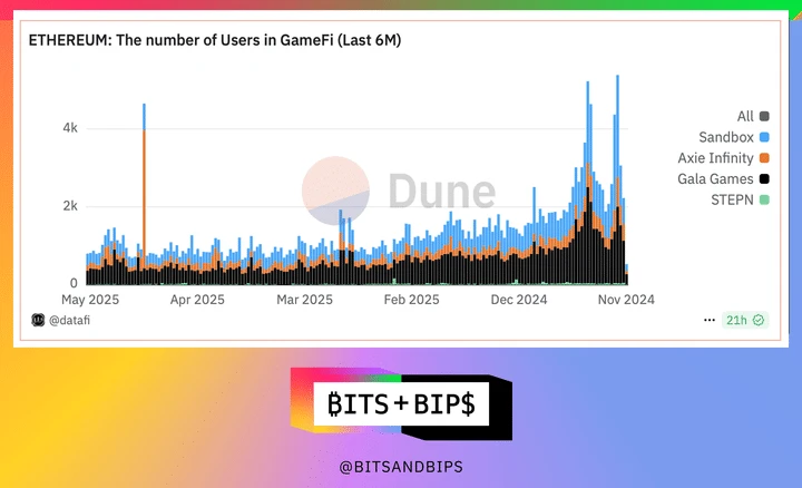 这些趋势与加密行业如何关联?数据显示,GameFi 面临困境,部分原因可能是 GameFi 的用户基础远小于整个游戏市场。以以太坊为例(该领域的主导区块链),关键指标如交易量和用户数量都大幅下降,从下方图表中可以清晰看到这一趋势(第二张图表需要从右向左阅读)。