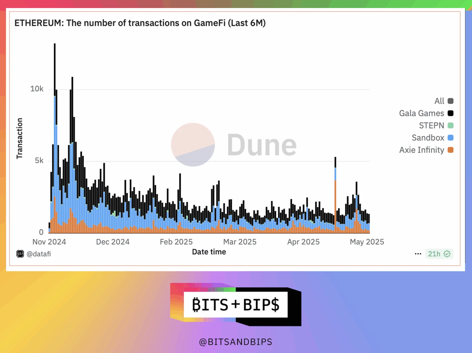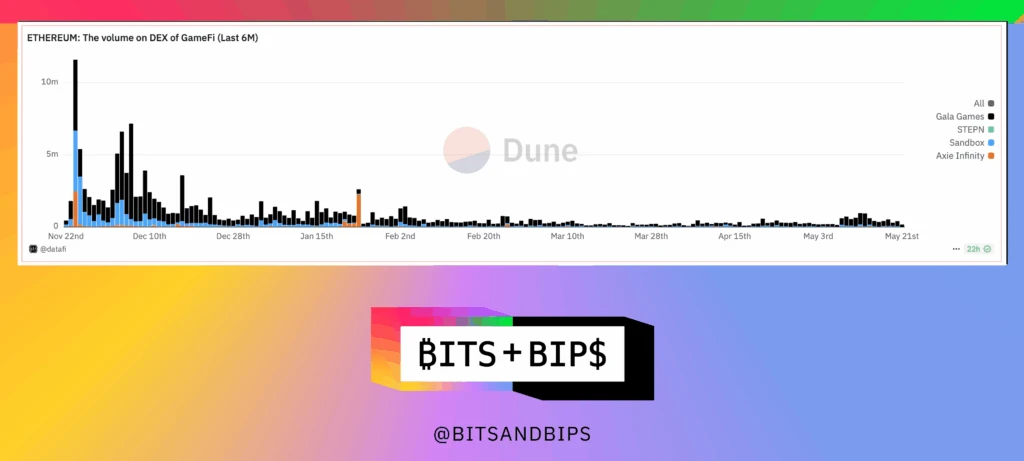 这个问题很难回答。一个可以提供线索的数据点是去中心化交易所(DEX)的 GameFi 代币交易量。正如下图所示,仅观察基于以太坊的代币,趋势同样消极,尽管日交易量仍达数十万美元。其他区块链如 Polygon 和 BNB 的趋势也相同。