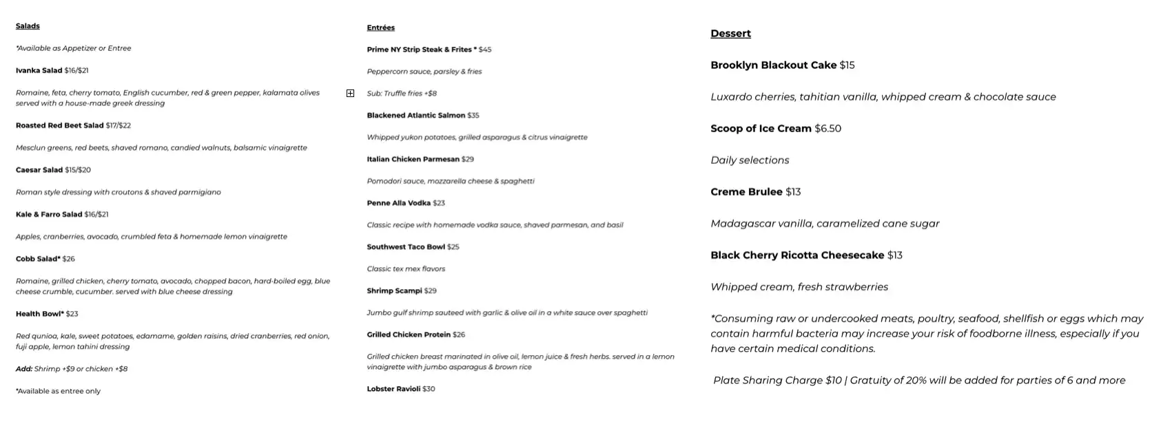 以位于纽约的 TRUMP GRILL 为例,顶配沙拉额外加配大虾 32 美元,纽约 prime 级西冷牛排升级黑松露薯条 53 美元,搭配卢卡多樱桃、大溪地香草、鲜奶油及巧克力酱的布鲁克林黑森林蛋糕 15 美元,共计花费 100 美元。大手一挥给 20% 的小费,再加上大约 9% 的消费税,合计不超过 130 美元。