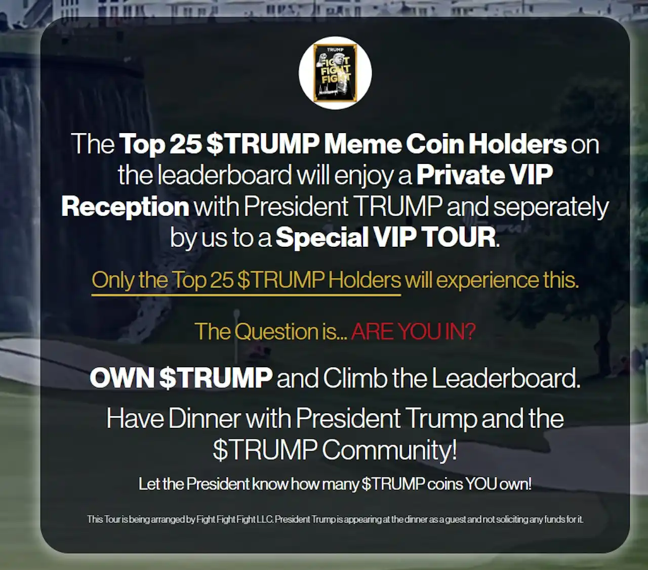 这场晚宴无异于一场加密行业的镀金游戏,由 CIC Digital LLC(特朗普家族旗下企业集团的子公司)和 Fight Fight Fight LLC 于 4 月 23 日联合宣布,他们将此活动宣传为「世界上最尊贵的邀请」,并为幸运的与会者提供「亲耳聆听特朗普总统谈论加密货币未来」的机会。