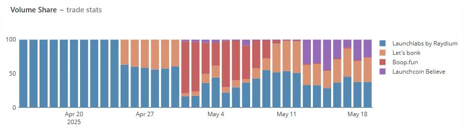 但在 Solana 链上新的发行平台中,出现了一些其他的面孔。在这些新的发行平台中,根据市值占比,目前占比最多的是 Raydium 新的发行平台 LaunchLabs 占 38.1% ,其次是 Let's bonk 占比 36% ,此后是 Believe 占比 25.8% 以及 Boop.fun 占比 1% 。