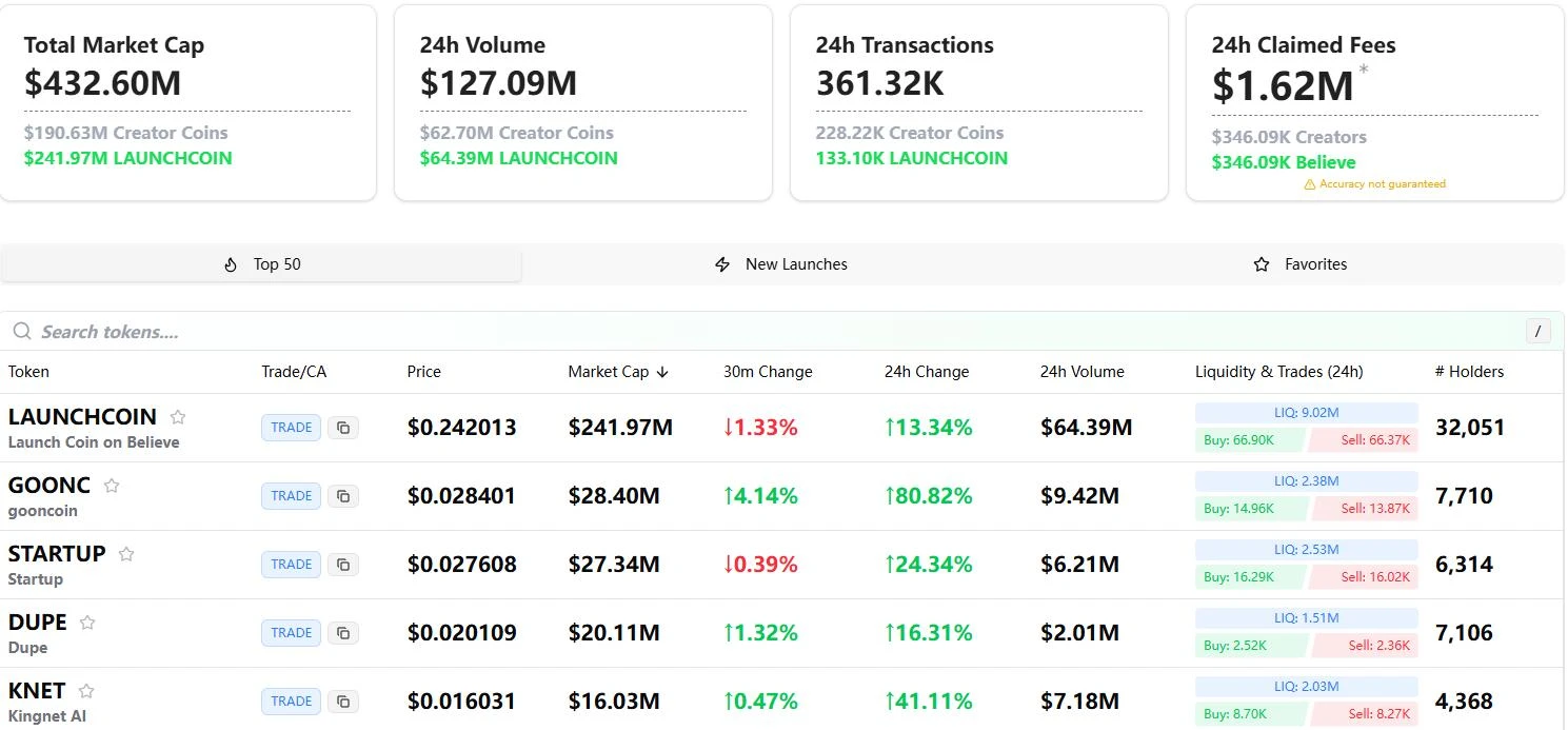 Believe 在短期的 ICM 叙事概念之后,整体生态热度已逐渐在下降。据 believescreener 数据显示,目前平台总市值约为 4.33 亿美元,其中平台币$LAUNCHCOIN 市值约为 2.42 亿美元,占总市值的 56.2% 。除此之外,整个生态中市值超 1, 000 万的项目仅有五个。
