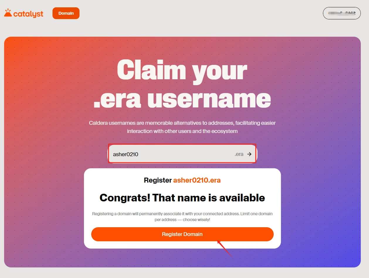 STEP 1. 注册一个.ena 域名(链接: https://catalyst.caldera.xyz/domain ),点击 Sign in 后连接钱包进行登录,选择“Domain”输入名字后选择“Register Domain”即可(无成本注册域名)。