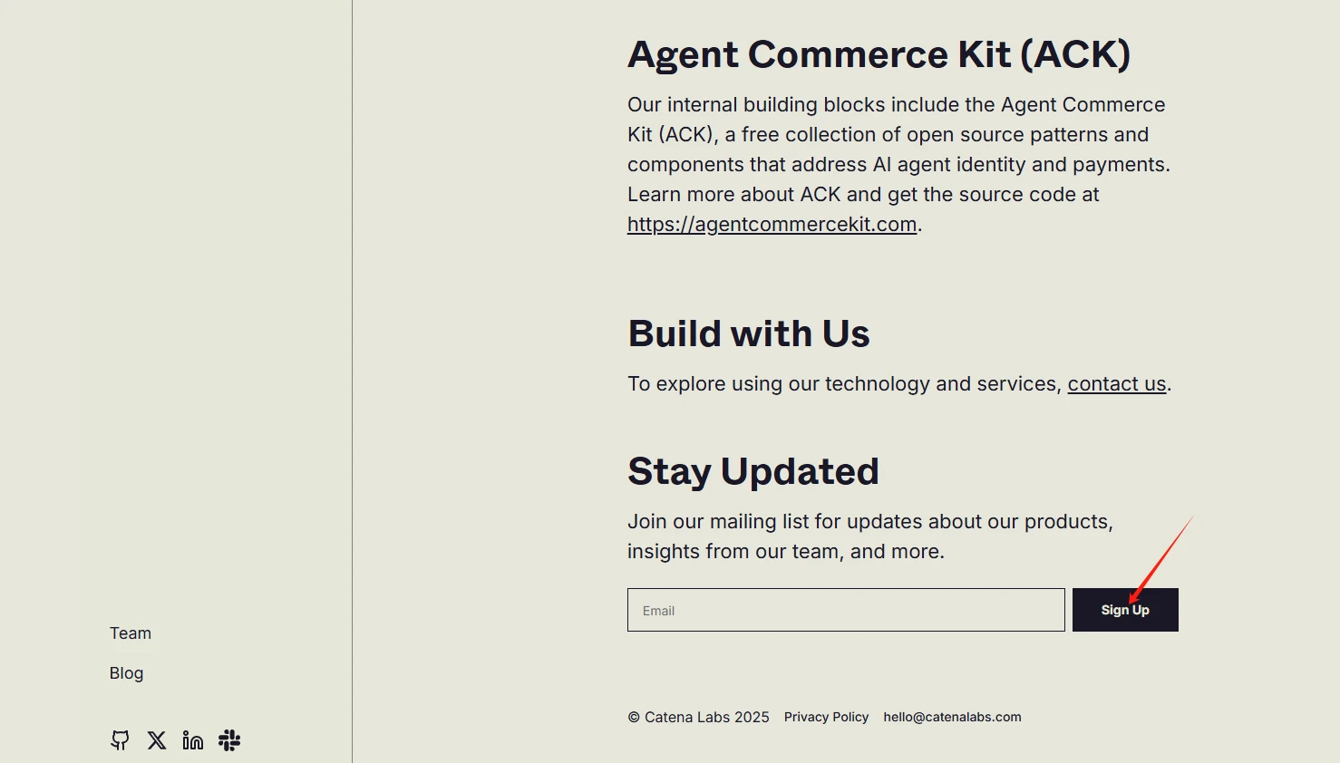 进入官方链接( https://catenalabs.com/ ),页面下拉至底部,填写个人邮箱后点击“Sign Up”以加入早期访问资格。