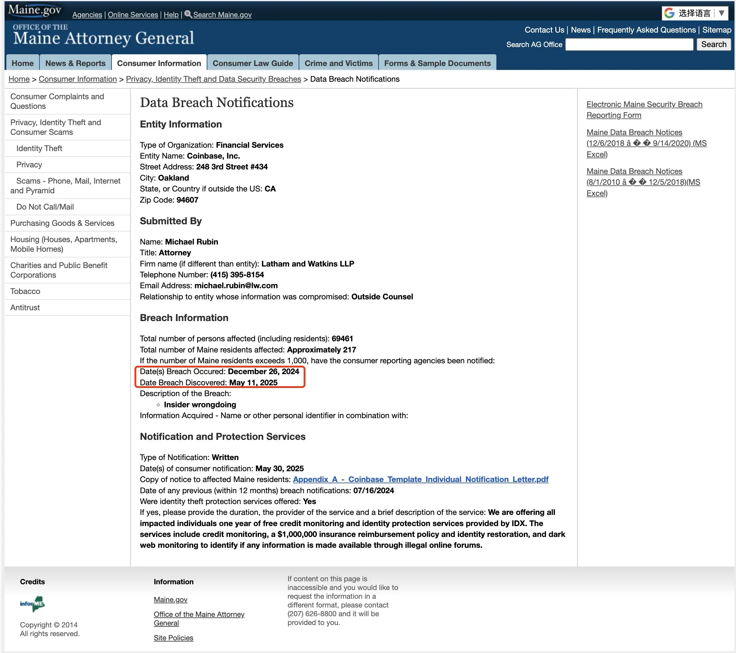 再看 5 月 20 日 Coinbase 向 缅因州总检察长办公室提交的报告 ,数据泄露事件发生的时间更早,是在 2024 年 12 月 26 日。