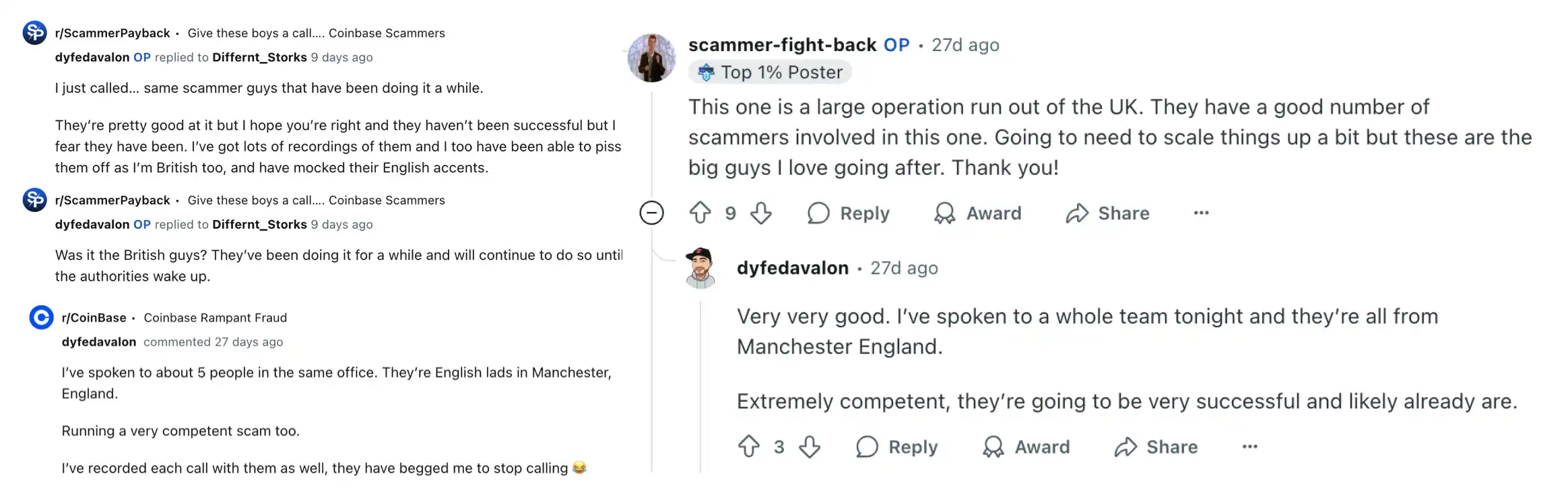 一位用户名为 Scammer-fight-back 的用户和自己的整个团队与骗子展开「对线」,他们多次打电话给这些骗子、录音、保存信息。最终他们追踪到:这些骗子多数来自英国曼彻斯特,办公在同一个小办公室里,用本地口音冒充 Coinbase 客服,一边套取信息,一边完成诈骗流程。