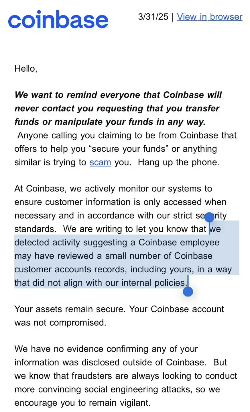 「我们检测到有迹象表明,一名 Coinbase 员工可能以不符合内部政策的方式,查看了少量 Coinbase 客户的账户记录,其中包括您的账户。」