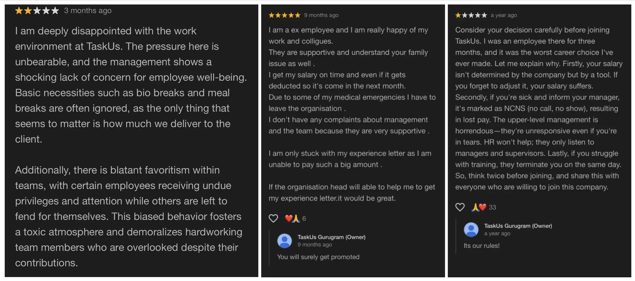 至于为什么有人愿意冒这么大风险泄密?Taylor 分享了更多从这些「印度黑奴」内部流出的内容,直指 TaskUs 的真实工作状态:厕所不让上,吃饭时间要靠抢,交付量不够就会被管理层集体冷处理;压力大得离谱,生病请假都会被记成『旷工』,工资直接扣;因为培训没跟上节奏,就被直接当场开除。