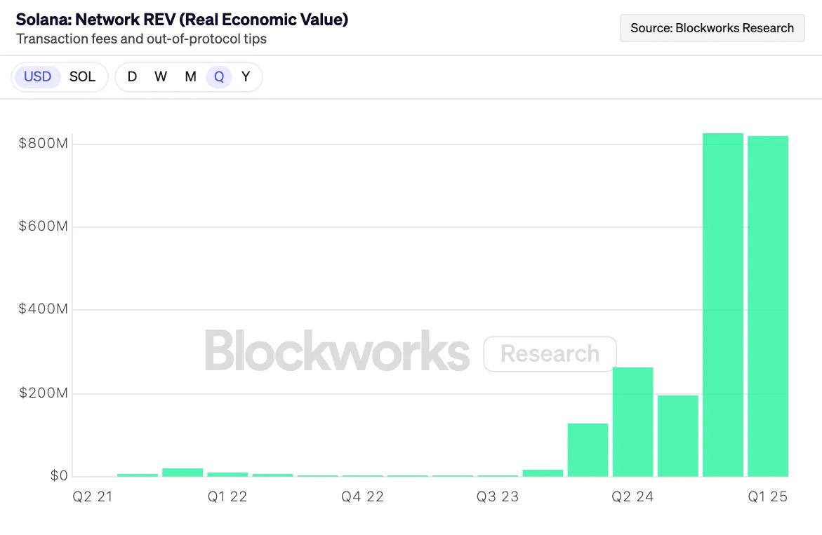 2024 年第四季度和 2025 年第一季度,是 Solana 有史以来表现最强劲的时期。链上应用总收入(或者说链 GDP)环比增长 321%,截至 2024 年底达到 8.25 亿美元。此外,这股势头延续至新年,2025 年 Q1 收入达 8.19 亿美元。仅 1 月份就贡献了 5.51 亿美元,而这在很大程度上得益于争议性的 TRUMP 的发行。横向对比,Solana 单季度收入已超越此前整年业绩。