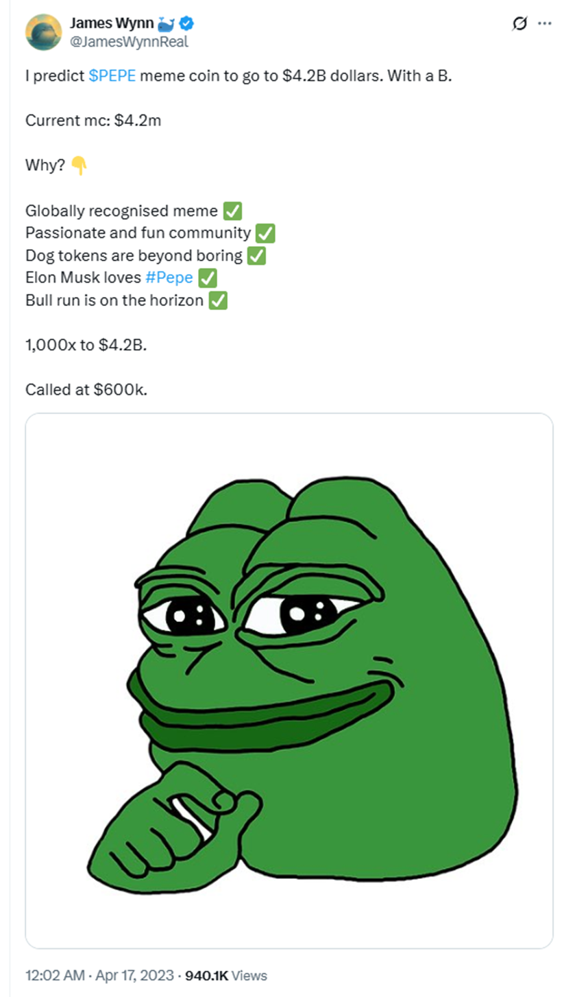 从社交媒体的信息来看,James Wynn在2023年开始加入推特,其初期的所有内容几乎都聚焦在PEPE币的推广和宣传上。2023年4月,James Wynn就预测PEPE代币的市值将涨到42亿美元。当时的市值是420万美元。时隔一年后,这个预言不仅成真,甚至超出了他当时的预期。2024年10月,PEPE市值最高突破100亿美元,成为市值最高的MEME币之一。