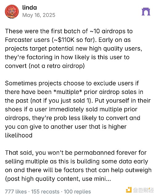 首批空投平均每次约 10 美元,为你的 Farcaster 钱包充值提供了一种便捷的方式。但 Farcaster 开发者生态系统负责人 Linda Xie 指出,一些项目会将之前多次参与空投的用户排除在外。如果你打算参与其中,请考虑尽可能长期持有,以最大限度地提高未来分发的机会。