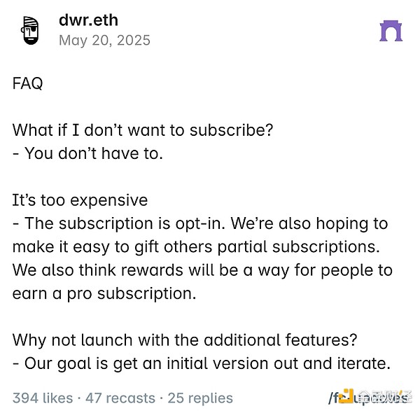 Pro 订阅计划:另外,Farcaster 联合创始人 Dan Romero 刚刚确认,团队正准备为 Farcaster 高级用户推出全新的“Pro”订阅级别。高级会员预计每月 10 美元,将提供 1 万个角色阵容、每篇帖子 4 张图片上传等高级功能。