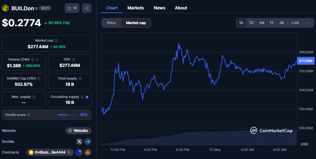 5 月 22 日晚 8 点,币安正式上缐 USD1 交易对,成为继 HTX 和 MEXC 之后第三家支援 USD1 的主流交易所。这一讯息如同投向市场的重磅炸弹,迅速引爆了与 USD1 相关的代币行情。币安 Alpha 平台上的 BUILDon(代币 B)首当其冲,6 小时内暴涨 480%,单日涨幅更是高达 192%,市值突破 2.2 亿美元,创下历史新高。社群裡,投资者们兴奋地讨论著:「USD1 这是要接棒 FDUSD,成为币安的新宠啊!」
