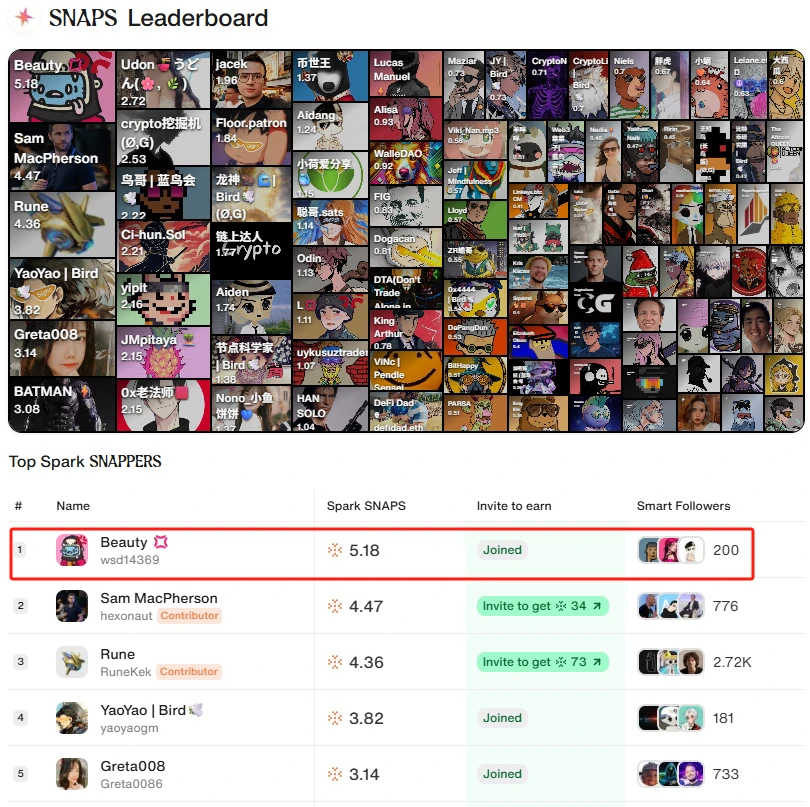 Cookie Snaps 功能刚刚推出,相较于 Kaito 赚 Yap 积分,目前 Cookies.fun 赚 Snaps 积分竞争还不算激烈,根据平台数据,与 Cookies.fun 合作的第一个项目 Spark 的 Snaps 榜单中,排名第一为 KOL Beauty ,仅有 5.18 积分,上榜的第 100 名为 0.23 积分,因此 只要“方法得当”就能第一时间拿到宝贵的 Snaps 积分,领跑积分榜 。