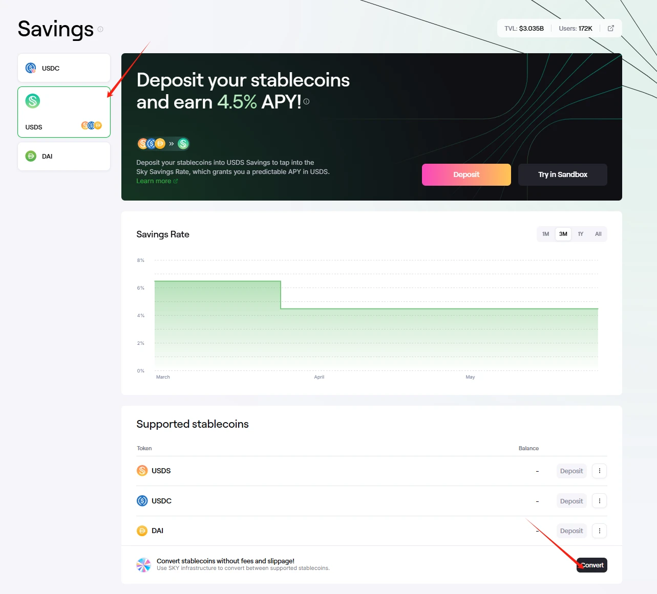 STEP 3. 在 Savings 栏目下选择 USDS 后点击页面下方的 “Convert”按钮,将 USDC 换成 USDS。