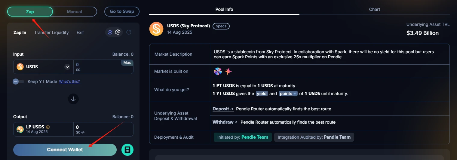 STEP 4. 回到积分界面,点击“Hold USDS YT or LP on Pendle”后将 USDS 换成 LP USDS。