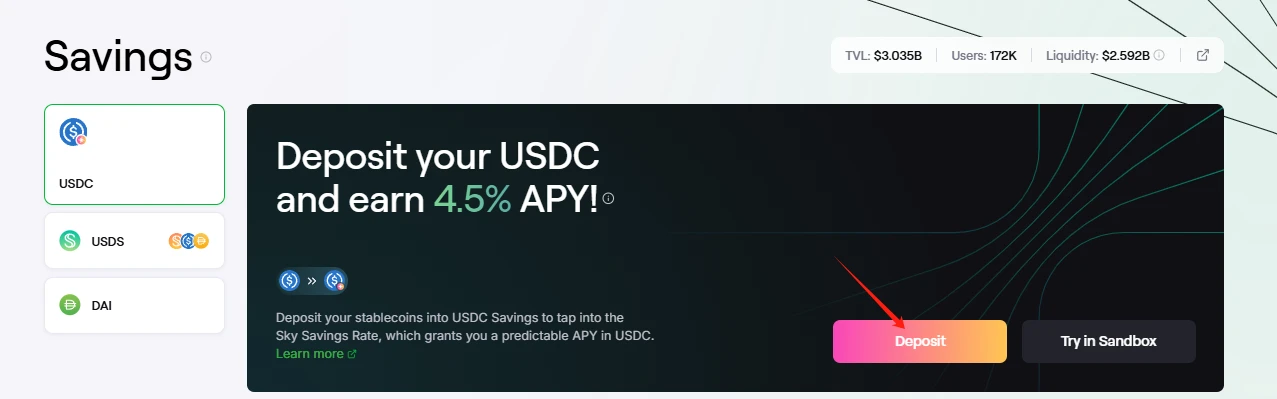 STEP 2. 点击“Deposit”后在 Spark 平台存入 USDC(建议存超 10 枚 USDC)。