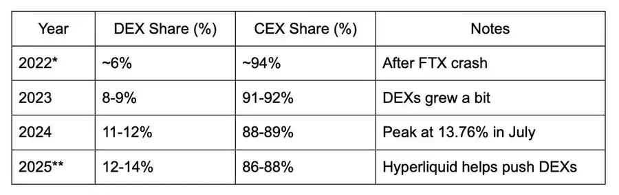 2022 年指 FTX 崩盘后(11 月至 12 月)。2025 年数据为截至 3 月 6 日的预估值,Hyperliquid 意识到了这一短板:如果用户体验不佳或流动性不足,用户不会大规模迁移到链上。因此,团队致力于打造「CEX 级别的速度和流动性,但完全链上化。」