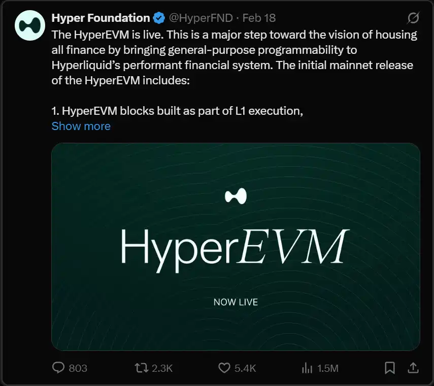 从永续合约到现货交易,Hyperliquid 的所有产品均建立在其定制区块链——Hyperliquid Layer 1 之上。2025 年 2 月 18 日,HyperEVM 已正式上线主网。