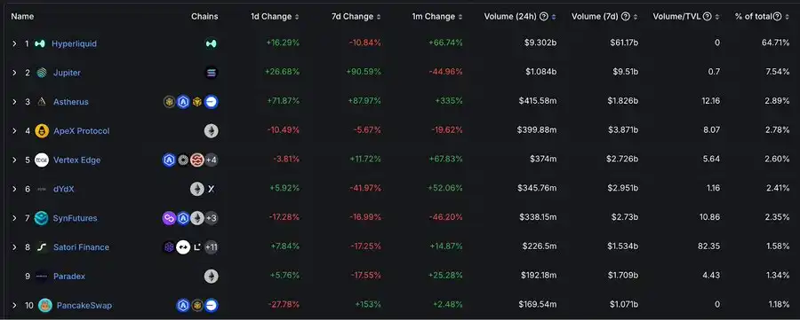 数据显示,在 24 小时内,链上永续合约的总交易量为 143.7 亿美元,而 @HyperliquidX 就占了惊人的 93 亿美元,占比高达 64.71%,展现出 Hyperliquid 在市场上的绝对统治力。