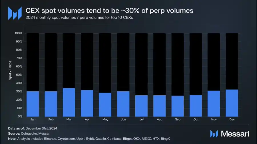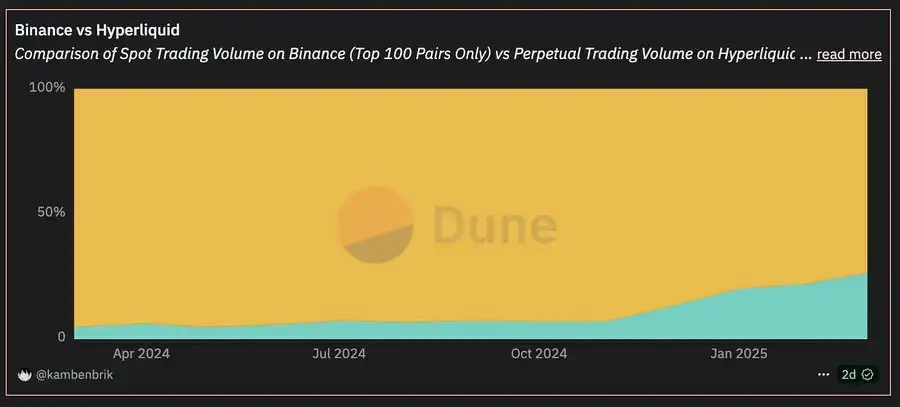 ·尽管 Hyperliquid 仍然小于像 Binance 这样的顶级 CEX,但它在某些月份缩小了差距,到了 2025 年 3 月,它的交易量占比超过了展示的总交易量的 26% (与 Binance 前 100 的现货交易对相比)。这一比较强调了一个链上高性能的永续合约交易所能够有效挑战甚至是主导的中心化现货市场。