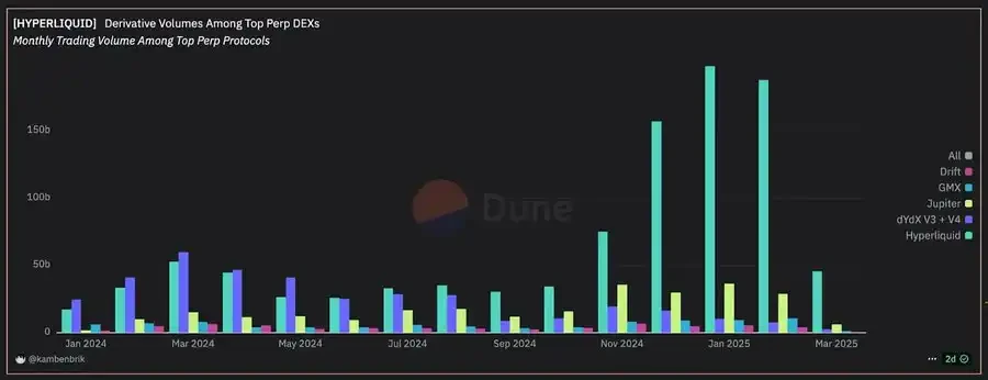 截至 2024 年 2 月,Hyperliquid 已占据 链上衍生品 DEX 交易量的 56% 。自 2024 年 7 月 起,其 月度永续合约交易量 超越主要竞争对手。2025 年 1 月,Hyperliquid 单月永续交易量达到 1960 亿美元,而 其他四大协议总和仅为 600 亿美元。