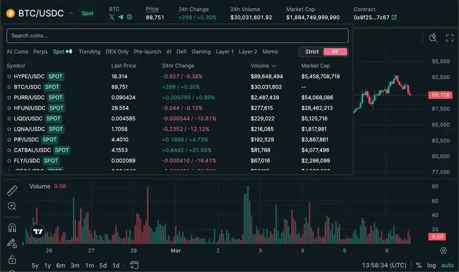相比于 Hyperliquid 庞大的 1.06 万亿美元永续合约市场,现货交易起步较小,但增长迅速。截至 2025 年初,随着关键更新(尤其是 BTC 的上线),Hyperliquid 正在逐步成为链上现货交易的有力竞争者。