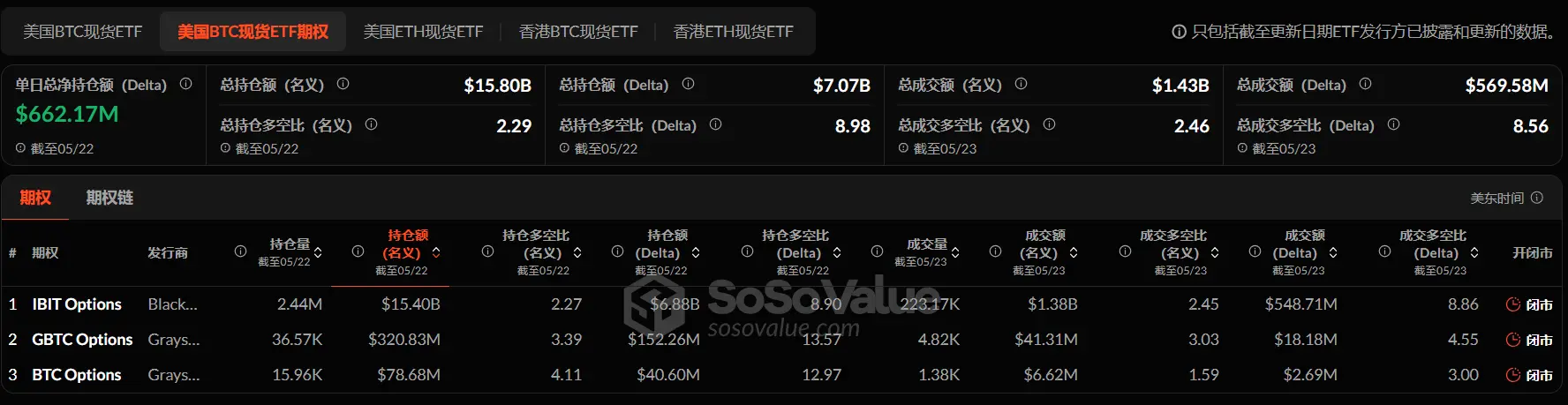 截至 5 月 23 日,美国比特币现货 ETF 期权名义总成交额为 14.3 亿美元,名义总成交多空比为 2.46。