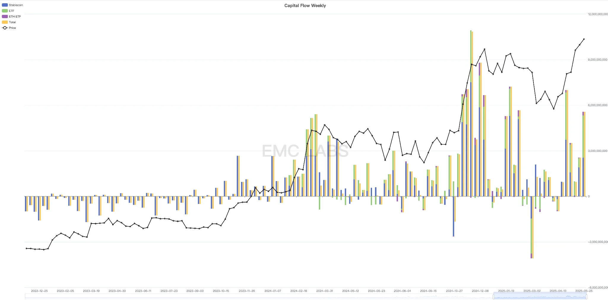 7 个交易日均保持了资金正向流入,全周共计流入 55.74 亿美元,其中稳定币 25.48 亿,BTC Spot ETF 27.75 亿,ETH Spot ETF 2.50 亿。