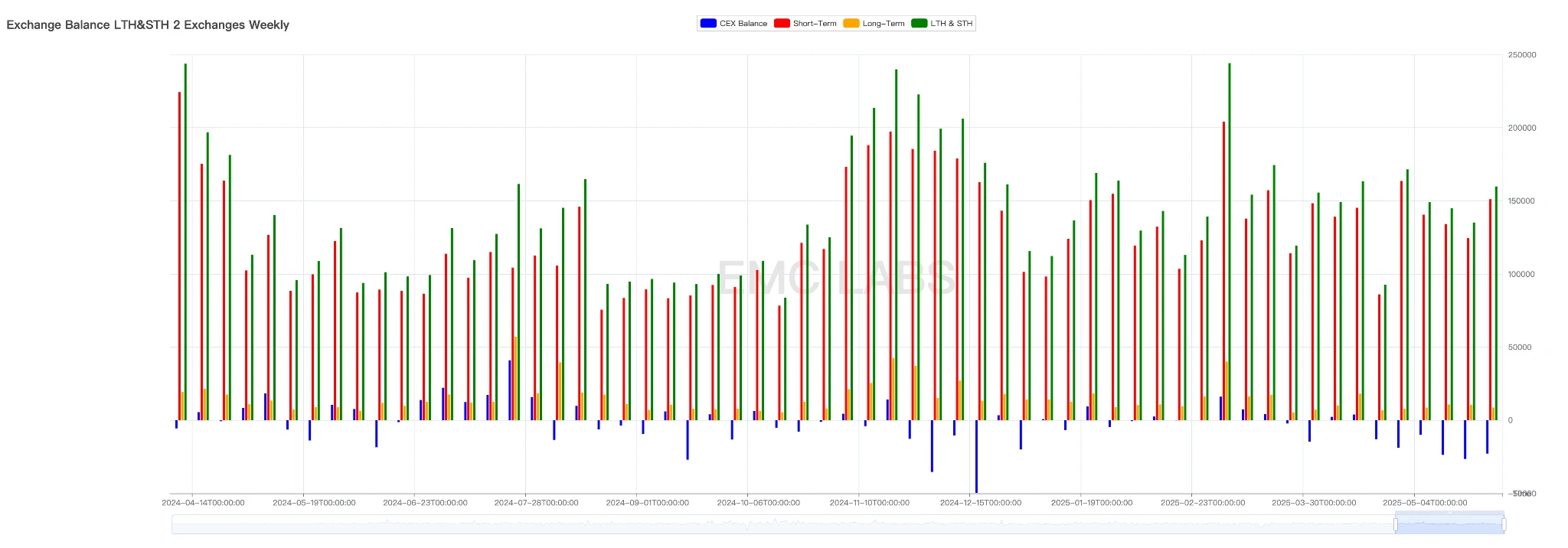 自 BTC 重返 10 万美元关口之后,长手再次启动减持,一改五周来交易所流入逐渐减少的态势,本周流入交易所的 BTC 达到 159869.37 枚。中心化交易所仍然处于流出态势,余量跌至 2987307 枚,但流出速度有所放缓。