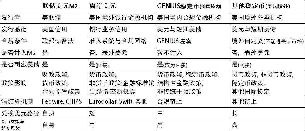 基于以上,GENIUS 法案的决策本质上是一个取舍和 trade-off,破釜沉舟以退为进:标志着 Federal 开始接受传统美元在原有金融系统下影响控制力下降的现实,主动进一步下放对美元货币的发行权和结算权(注:法币离岸美元中的大部分本身也来自于 Federal 表外的离岸银行信贷扩张属于影子货币,发行和清算的真实性基于准入系统和合规网络进行控制,并由主权级央行做背书和兑付过滤),面对 Crypto 金融发展的必然趋势将计就计,借鉴 DeFi Restaking 的先进玩法结合法币离岸美元在境外银行系统信用扩张进行表外延展的经验,通过鼓励合规机构发行稳定币形成一种 “链上离岸结构” 的新型 “链上影子货币” 模式,进一步放大流通层美元的货币乘数效应。