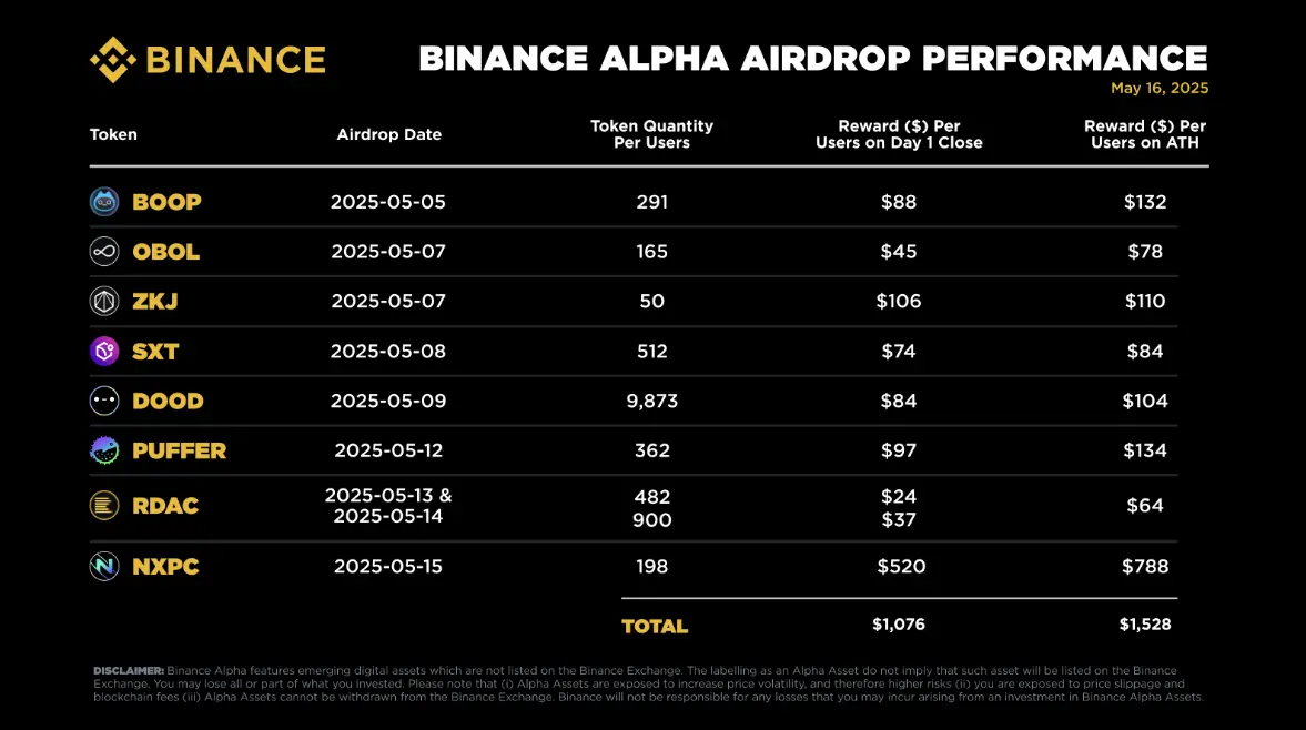尽管如此,Web3 参与所带来的“良性循环”正在为 Alpha 用户带来更多价值。Binance Alpha 还会定期向活跃用户发放空投奖励。自 5 月以来,平台已向用户分发了 8 次代币空投,按首日收盘价计算,累计每位用户平均获得了约 1076 美元的收益。
