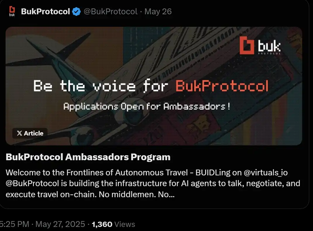 BukProtocol 面向 virtuals io 社区开启大使招募,推动 AI 驱动的旅行革新。