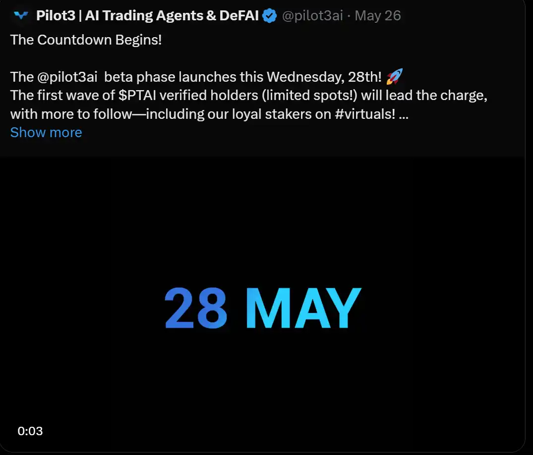 测试版将于 5 月 28 日面向 PTAI 持有者启动,pilot 3a i 本周三开启测试阶段,已验证的 $PTAI 持有者可优先体验。virtuals io 的质押用户将成为下一批开放对象,逐步扩大使用范围。
