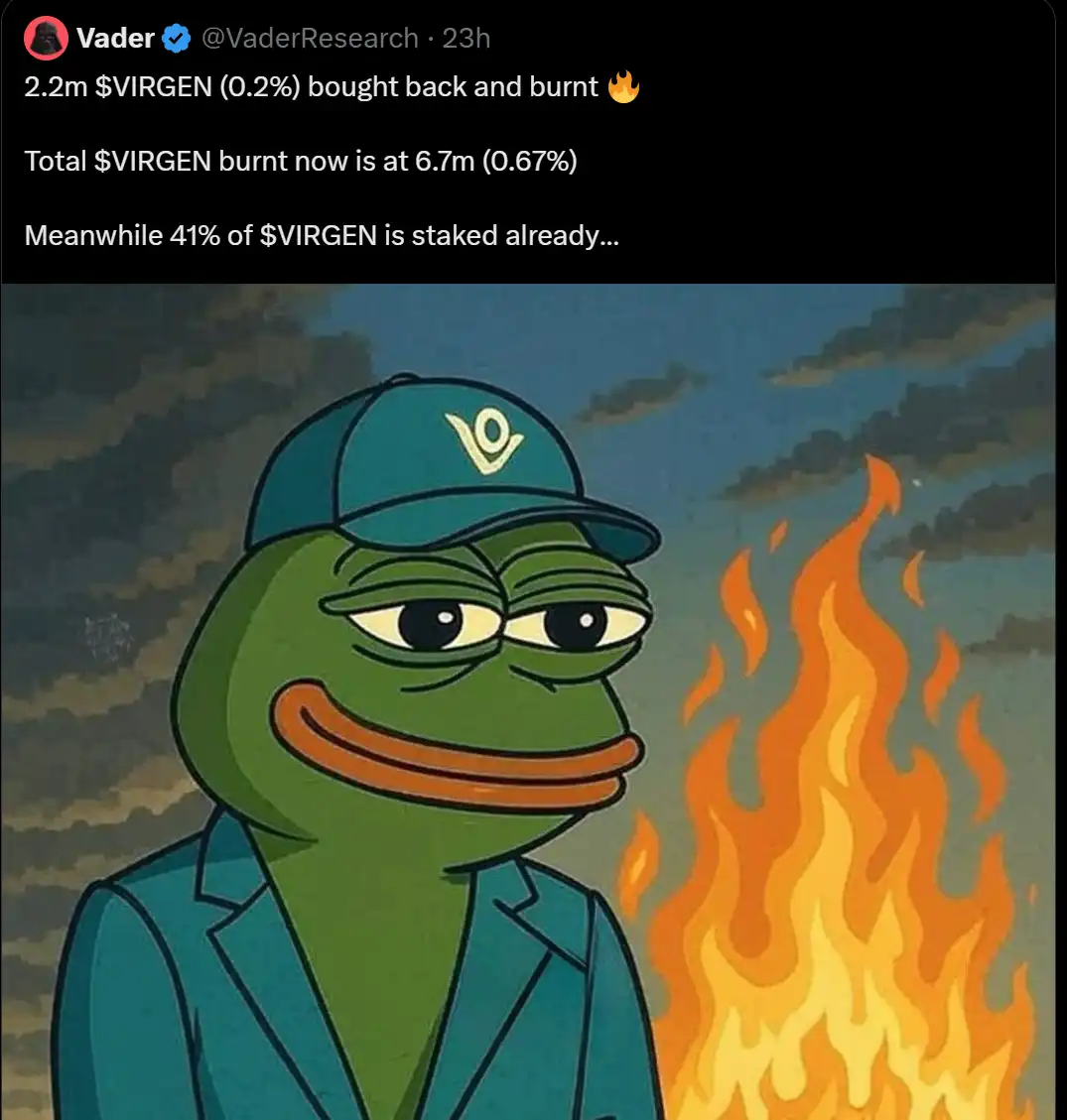 VIRGEN 四天内燃烧 670 万,锁仓率达 41% 。VaderResearch 报告称,已回购并销毁 220 万 $VIRGEN,总燃烧量达到 670 万。41% 的锁仓率显示出持币者的强烈信心和积极采纳。