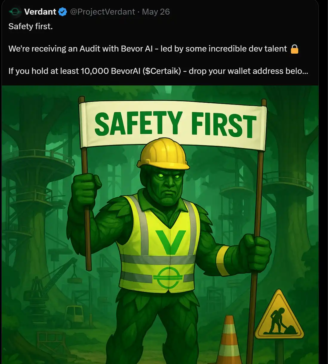 ProjectVerdant 宣布将通过 Bevor AI 进行安全审计。持有超过 1 万枚 $Certaik 的用户可提交钱包,参与代币发行后空投。